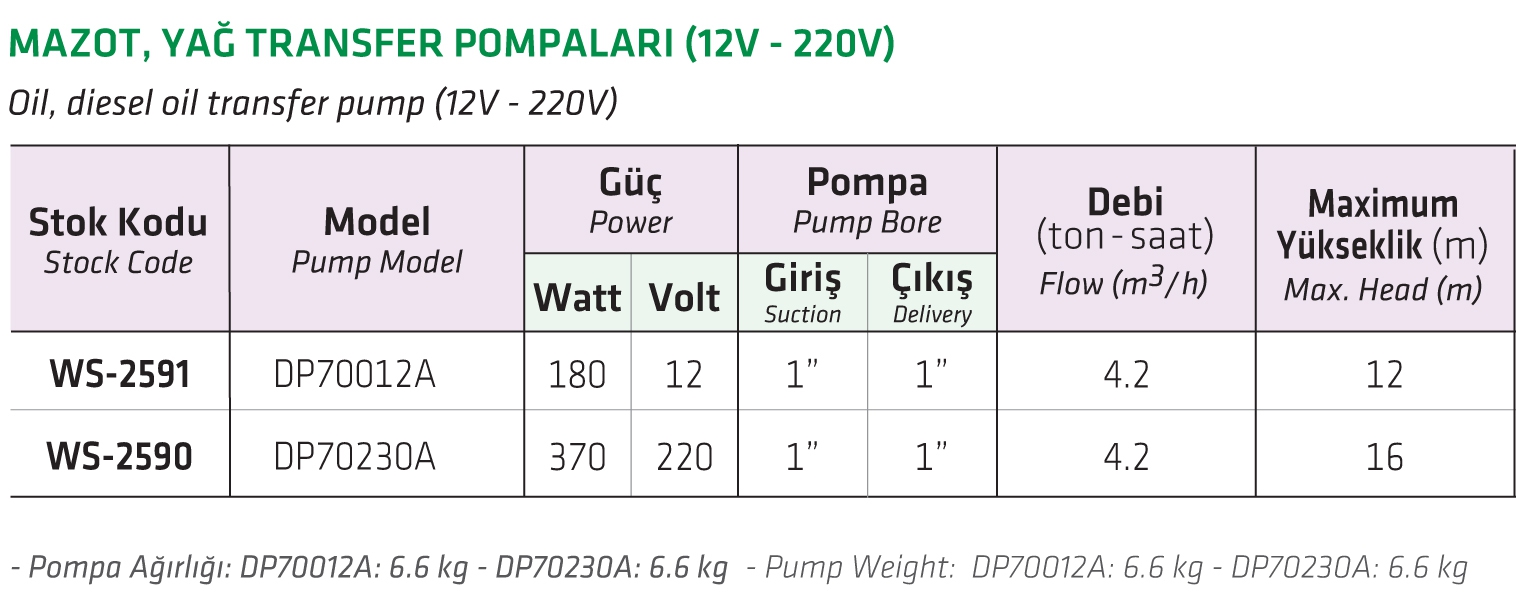 WATER SOUND DP70012A 180W 12V MAZOT YAĞ TRANSFER POMPASI