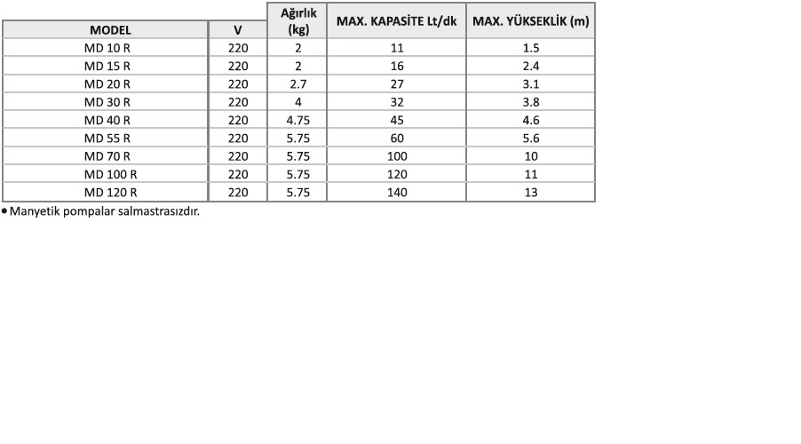 - 11 litre/dakika maksimum debi, 1.5 metre maksimum basınç kapasiteli, plastik fanlı, monofaze manyetik pompa MD 10 R Manyetik pompa , Boya ve asit pompası ve tüm Su Pompası ürünleri konusunda teknik bilgi danışmak için firmamıza ulaşabilirsiniz.