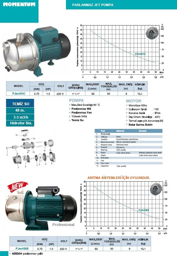 MOMENTUM PJm100S -1Hp -220v -Paslanmaz Gövdeli Jet Pompa