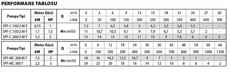 SPF-C serisi pompalar, dalgıç tipi foseptik pompalarının kullanımının mümkün olmadığı uygulamalar için dizayn edilmiş, açık (vortex) döküm çarklı düşey milli pompalardır. Katı partikül içeren lifli atık suların transferi için uygundur. Montaj plakasının 30 cm altına kadar sıvı yüksekliği ayarlanabilir. Pompa gövdesi akışkan içerisinde çalışırken elektrik motoru yüzeyde çalışmaktadır. Özel dizayn kaplin sayesinde ayar gerekmez, elektrik motoru kolaylıkla sökülür tamir veya yenisi ile değiştirilebilir. Seviye flatörü dalgıç tiplere oranla daha alt seviyeye ayarlanabilir. Mekanik salmastranın aşınması halinde elektrik motorunun yanma riski yoktur.