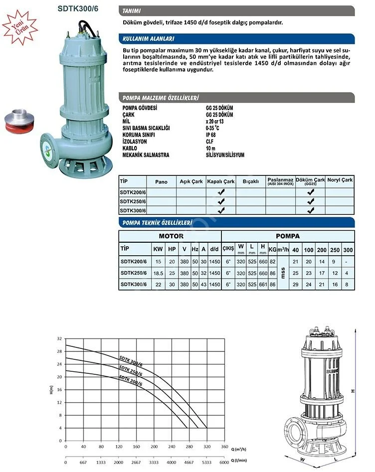 Sumak Pompanın yeni ürün gamına kattığı, bu tip foseptik dalgıç pompalar; 20Hp, 25Hp, 30Hp motor gücünde, 1450 d/d olmasından dolayı yoğun sıvıların tahliyesi için uygun yüksek kapasiteli, enerji tasarruflu dalgıç pompalardır. Bu tip pompalar; hafriyat alanlarında, kum ve maden ocaklarında, su baskınlarında, otel ve sitelerde, tünel inşaatlarında, arıtma tesislerinde kullanıma uygun, 10 metre kablolu, termistör korumalı olarak imal edilmektedir.Kuyu ve havuzlardan, kazan dairelerinden, bodrumlardan, göl ve derelerden yağmur suyu türünde az kirli suları basabilen bu pompalar oldukça geniş kullanım alanına sahiptir. Temiz ve az kirli suları basabilirler. Çift kademeli kapalı tip çarka sahiptirler. Susuz çalışmaya karşı seviye flatörü ile panosuyla beraber ayrıca verilmektedir. 10 Metre Kablosu, seviye flatörü, koruma ve kontrol panosu standart teslimat kapsamındadır.
