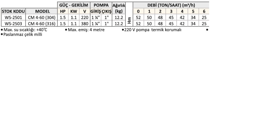 WATER SOUND CM 4-60 (304) 1,5 HP 220V YATIK MİLLİ ÇOK KADEMELİ PASLANMAZ ÇELİK SANTRİFÜJ POMPA