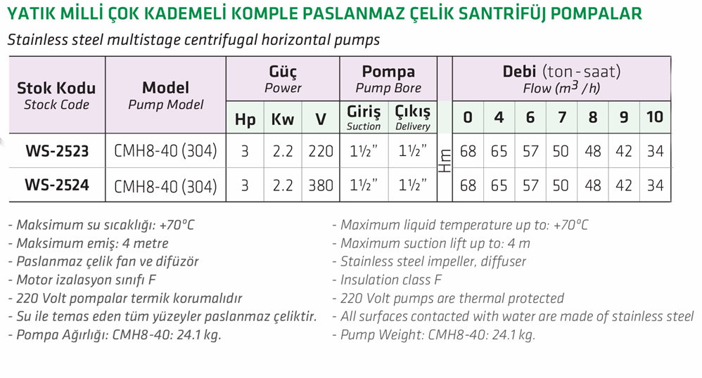 WATER SOUND CMH8-40 (304) 3 HP 220V YATIK MİLLİ ÇOK KADEMELİ KOMPLE PASLANMAZ ÇELİK SANTRİFÜJ POMPA