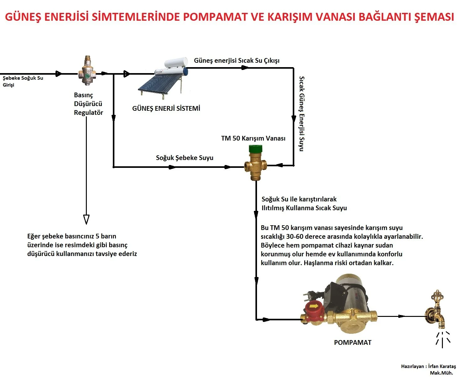 Pompamat cihazı 110 derece sıcak suya ve kısa süreli 115 C derece sıcak suya dayanıklıdır. Eğer güneş enerji sisteminiz sellektif yüzeyli düz panel yada vakum tüplü sistem ise bu cihazların ürettiği sıcak su 140-150 derecelere çıkmaktadır. Piyasada bu sıcaklığa dayanıklı pompamat cihazı olmadığından Alman Honeywell marka TM50 modeli karışım vanası kullanmanızı tavsiye ederiz. Karışım vanaları hem pompamatı yüksek sıcaklığa karşı korur hemde haşlanma riski olmadan dairede istenen sıcaklıkta konforlu su sağlar. Güneş enerji sistemi 100 derecenin üzerine çıkmayan kullanıcılara bile karışım vanası kullanması şiddetle tavsiye edilir.